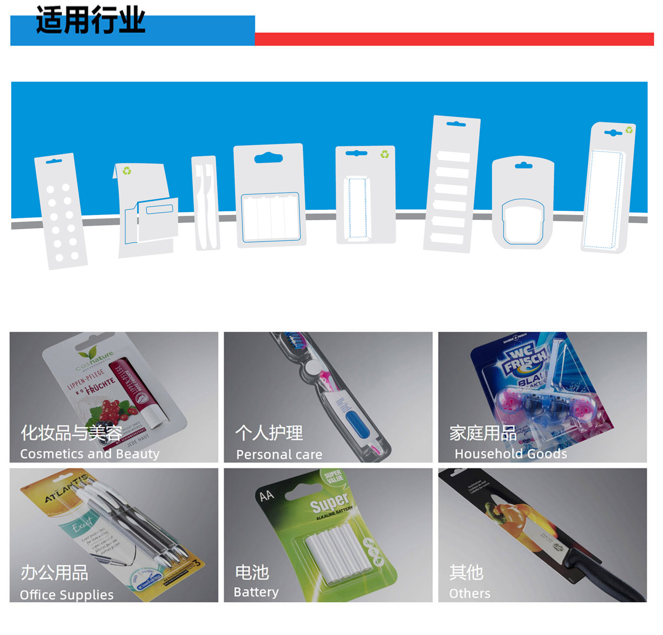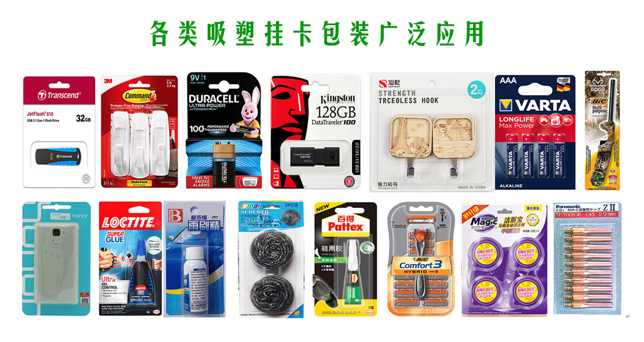 我們專業生產全自動紙塑(吸塑)包裝機,牙刷吸塑包裝機,電池掛卡包裝機,吸塑機等系列產品和多機智能聯動生產線及其相關配套設備。公司集生產、研發、銷售、售后為一體的企業。該產品適用于小五金(堿性電池、紐扣電池、膠水)、文具(卷筆刀、橡皮擦、涂改液、固體膠)、汽摩配(剎車片,雨刮片)、日用品(剃須刀、牙刷、牙線)、化妝品(唇膏,指甲刀,香水)、藥品(紅花油、風油精,)、玩具(小汽車,指尖陀螺,手表)、醫療器械、食品、等行業相關產品的紙塑包裝。