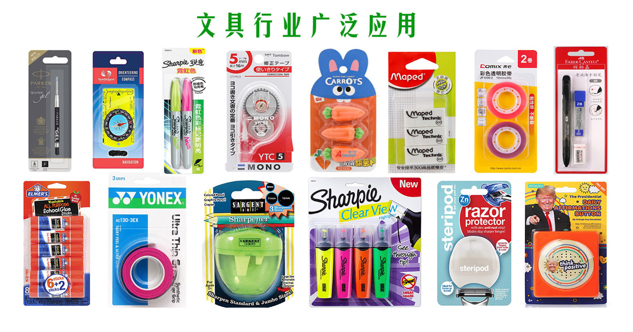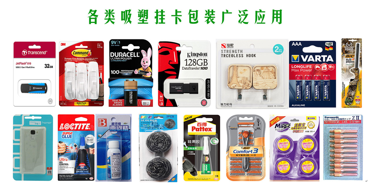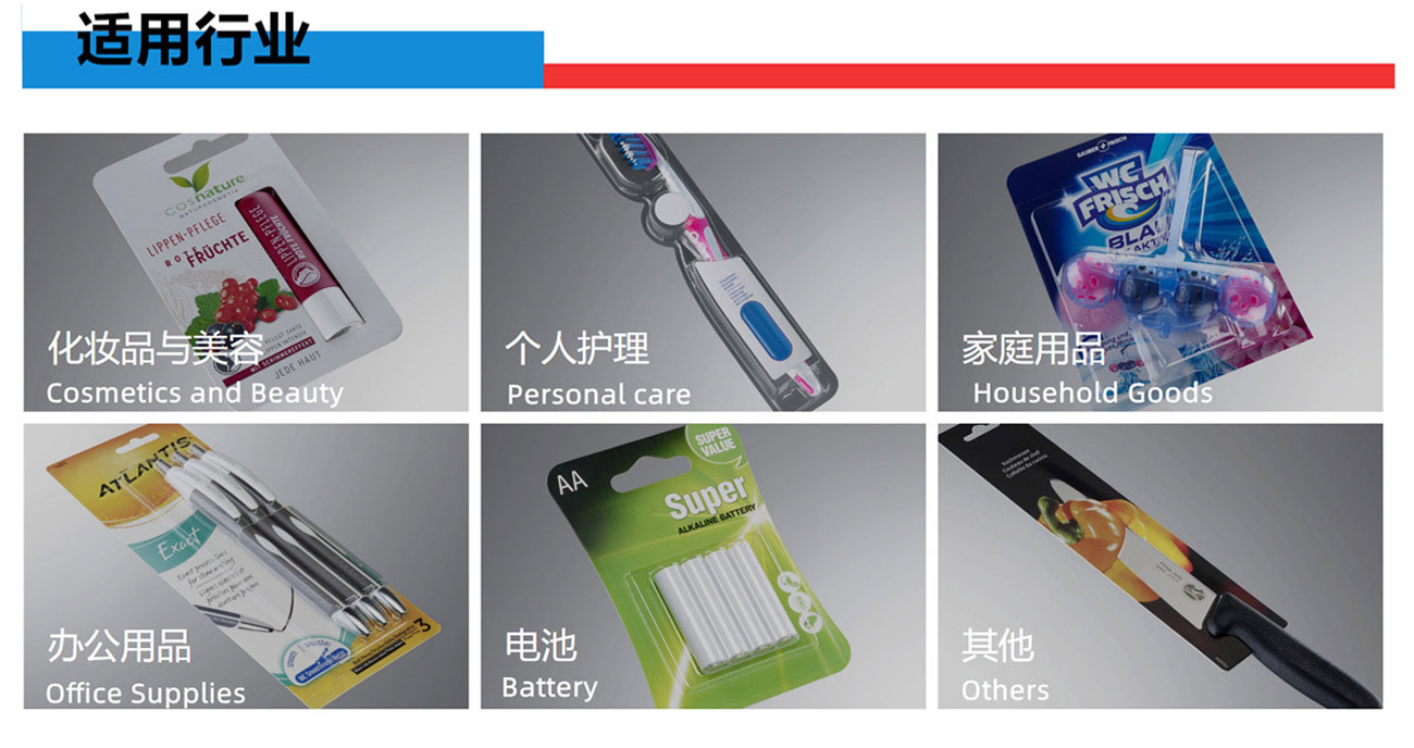 我們專業(yè)生產(chǎn)全自動紙塑(吸塑)包裝機(jī),牙刷吸塑包裝機(jī),電池掛卡包裝機(jī),吸塑機(jī)等系列產(chǎn)品和多機(jī)智能聯(lián)動生產(chǎn)線及其相關(guān)配套設(shè)備。公司集生產(chǎn)、研發(fā)、銷售、售后為一體的企業(yè)。該產(chǎn)品適用于小五金(堿性電池、紐扣電池、膠水)、文具(卷筆刀、橡皮擦、涂改液、固體膠)、汽摩配(剎車片,雨刮片)、日用品(剃須刀、牙刷、牙線)、化妝品(唇膏,指甲刀,香水)、藥品(紅花油、風(fēng)油精,)、玩具(小汽車,指尖陀螺,手表)、醫(yī)療器械、食品、等行業(yè)相關(guān)產(chǎn)品的紙塑包裝。